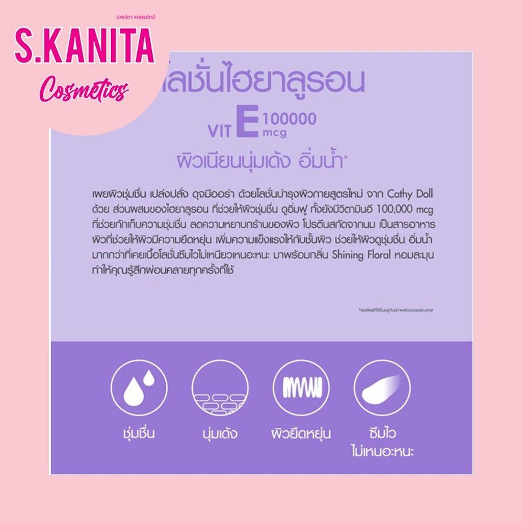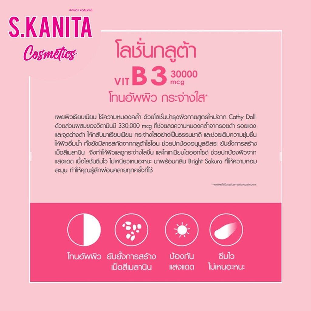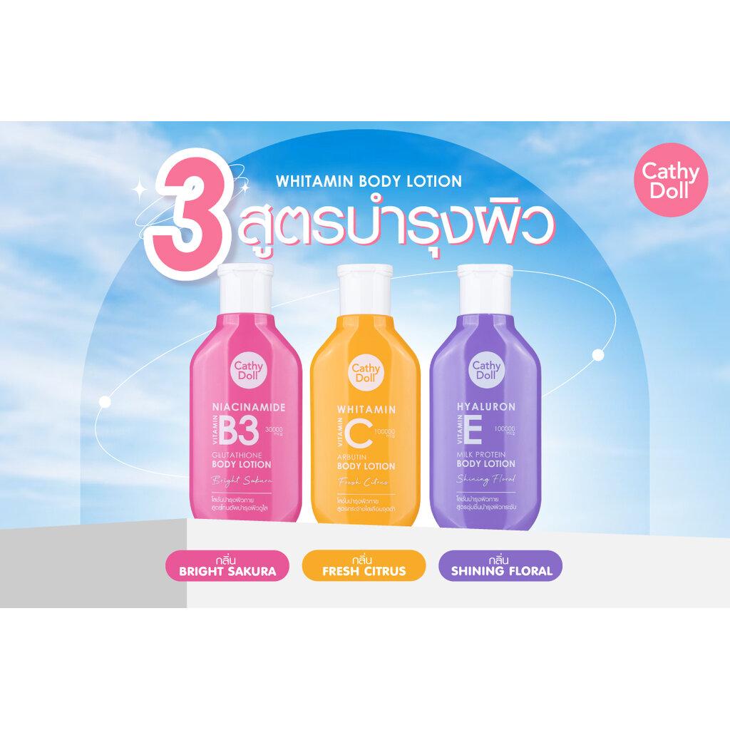 วิธีการใช้ บีบโลชั่นลงบนฝ่ามือในปริมาณที่พอเหมาะ จากนั้นทาลูบไล้บนผิวให้ทั่วทั้งร่างกาย เพื่อประสิทธิภาพที่ดียิ่งขึ้น ควรใช้เป็นประจำในทุกเช้าและเย็น 🌸ไบร์ทซากุระ🌸 CATHY DOLL ไนอาซินาไมด์วิตามินบี3กลูต้าไธโอนบอดี้โลชั่น 150ML เผยผิวดุจมีออร่า ด้วยโลชั่นบำรุงผิวกายสูตรใหม่จาก Cathy Doll ด้วยส่วนผสมของวิตามินบี3เข้มข้น ที่ช่วยลดความหมองคล้ำ เติมความชุ่มชื่น พร้อมบำรุงผิวกระจ่างใสขึ้นอย่างเป็นธรรมชาติ 🌸รายละเอียดสินค้า🌸 เผยผิวดุจมีออร่า ด้วยโลชั่นบำรุงผิวกายสูตรใหม่จาก Cathy Doll ด้วยส่วนผสมของวิตามินบี3เข้มข้น ที่ช่วยลดความหมองคล้ำ เติมความชุ่มชื่น พร้อมบำรุงผิวกระจ่างใสขึ้นอย่างเป็นธรรมชาติ และสารสกัดจากกลูต้าไธโอน ช่วยฟื้นฟูเซลล์ผิวที่เสื่อมสภาพให้กลับมาแข็งแรงขึ้นอีกครั้ง เนื้อโลชั่นซึมไว ไม่เหนียวเหนอะหนะ มาพร้อมกลิ่นไบร์ท ซากุระ หอมละมุนที่จะทำให้คุณรู้สึกผ่อนคลายทุกครั้งที่ใช้ 💜ไชน์นิ่งฟลอรัล💜 CATHY DOLL ไฮยาลูรอนวิตามินอีมิลค์โปรตีนบอดี้โลชั่น 150ML เผยผิวชุ่มชื่นกระจ่างใสดุจมีออร่า ด้วยโลชั่นบำรุงผิวกายสูตรใหม่จาก Cathy Doll ด้วยส่วนผสมของไฮยาลูรอน ที่ช่วยให้ผิวชุ่มชื่น ดูอิ่มฟู 💜รายละเอียดสินค้า💜 เผยผิวชุ่มชื่นกระจ่างใสดุจมีออร่า ด้วยโลชั่นบำรุงผิวกายสูตรใหม่จาก Cathy Doll ด้วยส่วนผสมของไฮยาลูรอน ที่ช่วยให้ผิวชุ่มชื่น ดูอิ่มฟู ทั้งยังมีวิตามินอีเข้มข้น ที่ช่วยกักเก็บความชุ่มชื่น ลดความหยาบกร้านของผิว โปรตีนสกัดจากนม เป็นสารอาหารผิวที่ช่วยให้ผิวมีความยืดหยุ่น เพิ่มความแข็งแรงให้กับชั้นผิว ช่วยให้ผิวดูชุ่มชื่น อิ่มน้ำมากกว่าที่เคย เนื้อโลชั่นซึมไว ไม่เหนียวเหนอะหนะ มาพร้อมกลิ่นไชน์นิ่ง ฟลอรัล หอมละมุนที่จะทำให้คุณรู้สึกผ่อนคลายทุกครั้งที่ใช้ 🍋เฟรชซิตรัส🍋 CATHY DOLL ไวท์ทามินวิตามินซีอาร์บูตินบอดี้โลชั่น 150ML เผยผิวชุ่มชื่นกระจ่างใสดุจมีออร่า ด้วยโลชั่นบำรุงผิวกายสูตรใหม่จาก Cathy Doll ช่วยลดเลือนความหมองคล้ำด้วยอนุพันธ์วิตามินซี 3-o-ETHYL ASCORBIC ACID ที่มีความบริสทุธิ์ถึง 99% มีฤทธิ์เหมือนวิตามินซีธรรมชาติ 🍋รายละเอียดสินค้า🍋 เผยผิวชุ่มชื่นกระจ่างใสดุจมีออร่า ด้วยโลชั่นบำรุงผิวกายสูตรใหม่จาก Cathy Doll ช่วยลดเลือนความหมองคล้ำด้วยอนุพันธ์วิตามินซี 3-o-ETHYL ASCORBIC ACID ที่มีความบริสทุธิ์ถึง 99% มีฤทธิ์เหมือนวิตามินซีธรรมชาติ แต่มีความเสถียรกว่า ช่วยปรับผิวให้กระจ่างใสขึ้นอย่างเป็นธรรมชาติ ผสานสารสกัดจากอาร์บูติน ช่วยยับยั้งการผลิตเม็ดสีเมลานิน ฟื้นบำรุงผิวหมองคล้ำให้กลับมาเรียบเนียนขาวกระจ่างใสมากยิ่งขึ้น ทั้งยังมี K
